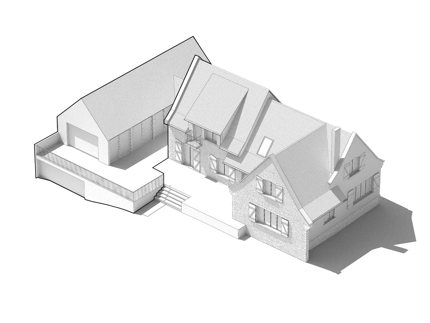 L' extension projetée, en résonance avec la façade pignon, crée un dialogue esthétique et formel avec l'architecture existante. Le traitement épuré du volume, associé à une façade lissée à la chaux, confère à cette nouvelle intervention une lisibilité claire et distincte en lien avec l'existant, tout en s’intégrant harmonieusement au tissu architectural environnant.