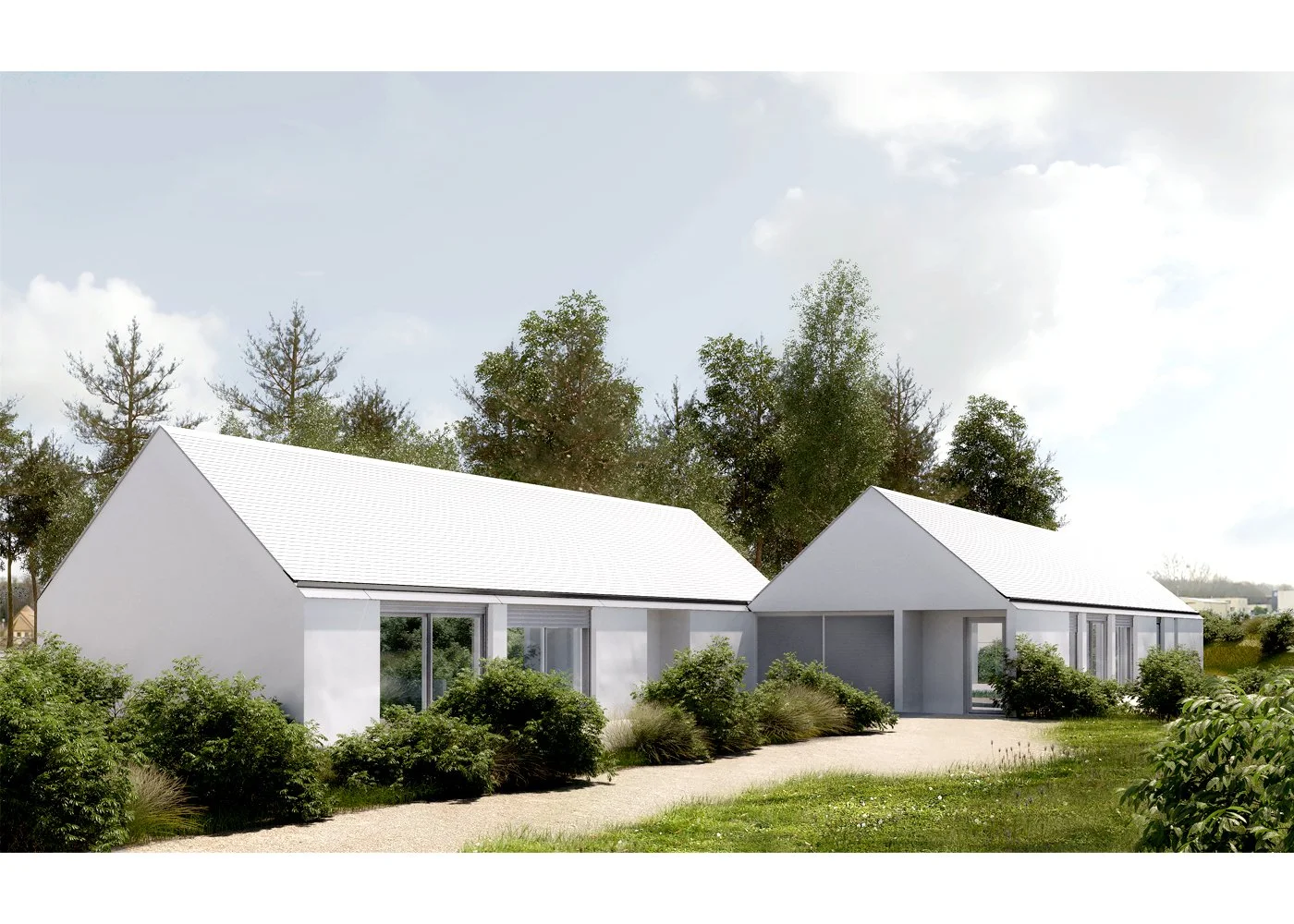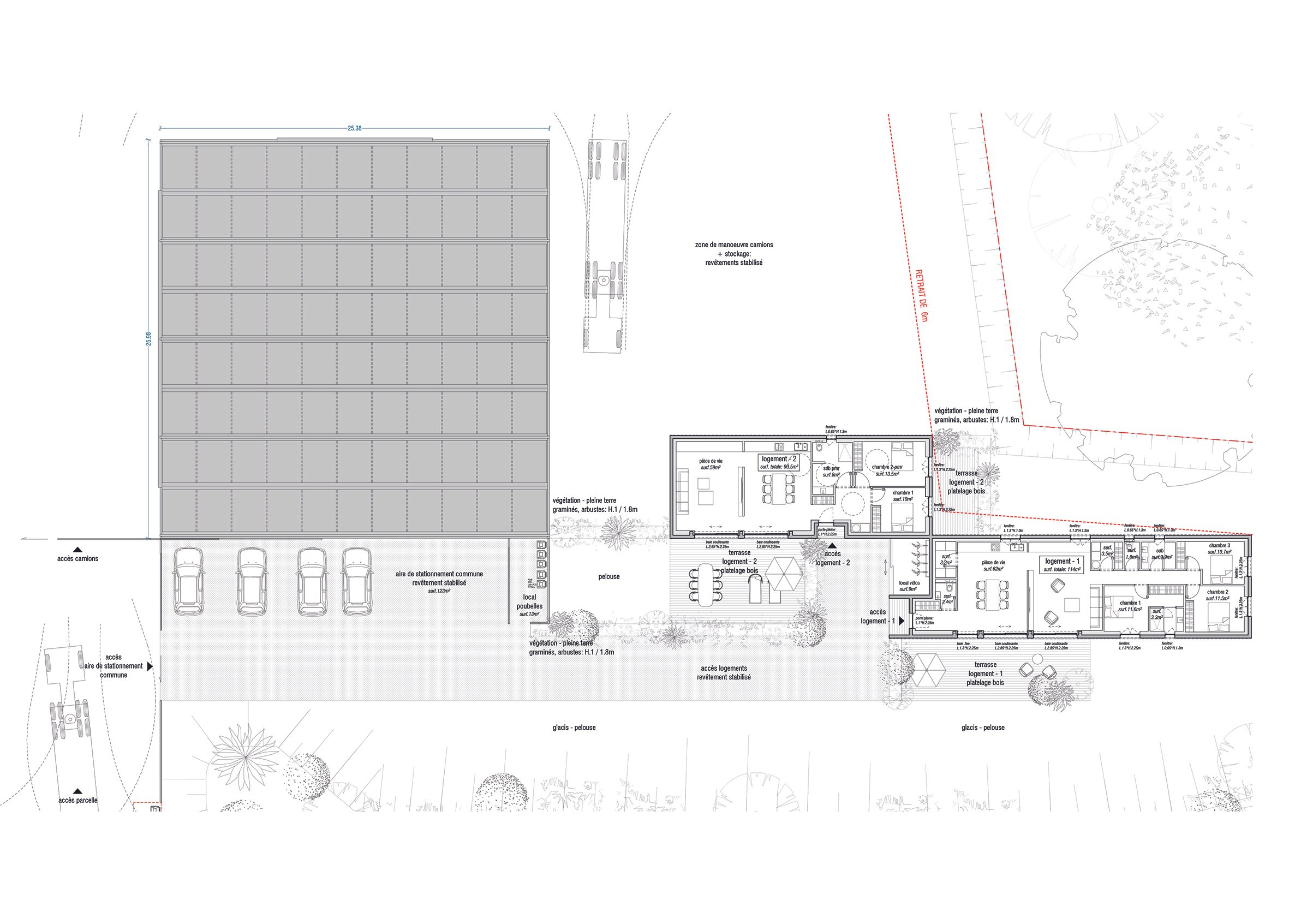 Un nouvel accès est créé depuis la D44, desservant à la fois la serre et les logements. Le terrain conserve en grande partie ses clôtures actuelles, et une aire de stationnement commune, dissimulée derrière le talus, Les matériaux utilisés pour les constructions respectent une esthétique sobre et durable, adaptée au contexte agricole environnant.