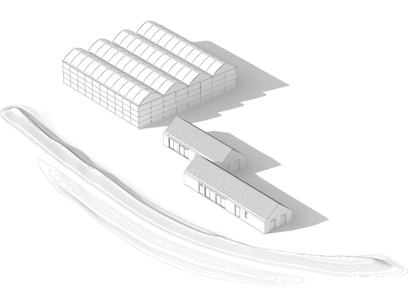 Un talus végétalisé de 1,60m de hauteur, formé avec la terre excavée, crée une barrière visuelle entre la D44 et les constructions. La serre est construite à partir de structures métalliques préfabriquées, tandis que les deux logements mitoyens ont une conception simple et fonctionnelle rappelant les bâtiments agricoles.
