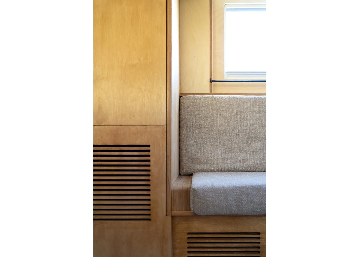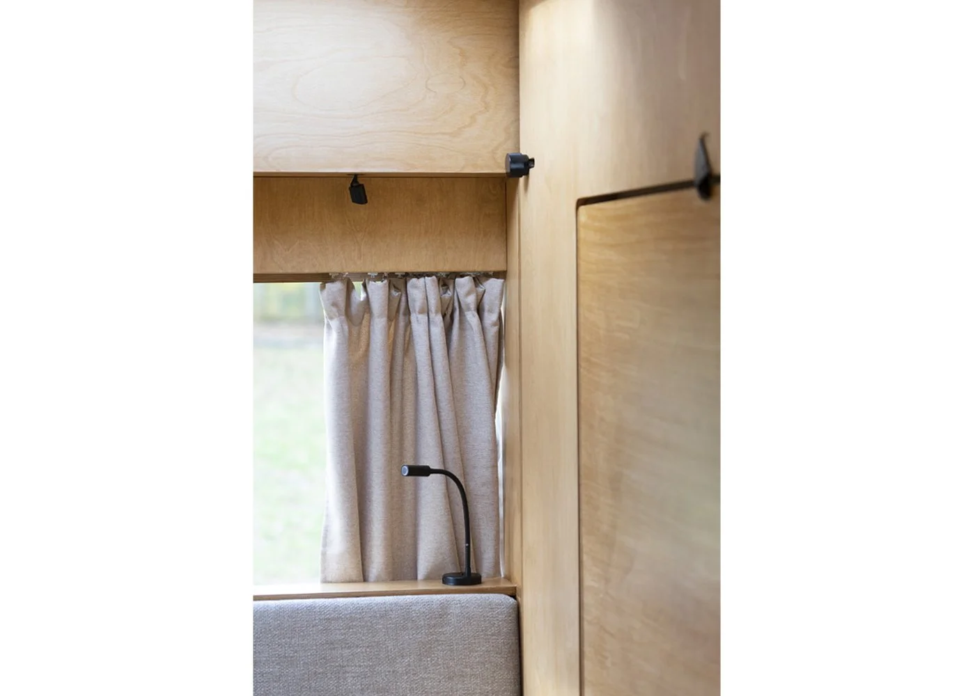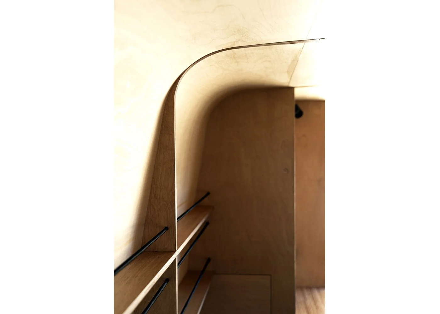 L’ aménagement ultra-fonctionnel et simple d'utilisation permet de passer d'un espace-travail à un espace-détente en un seul geste. Cette flexibilité se traduit par la manipulation d' un dispositif entièrement escamotable composé d'un complexe de panneaux de contreplaqué dans lequel s'intègre plusieurs fonctions: un lit double, un bureau / table de repas et un ensemble de rangements.