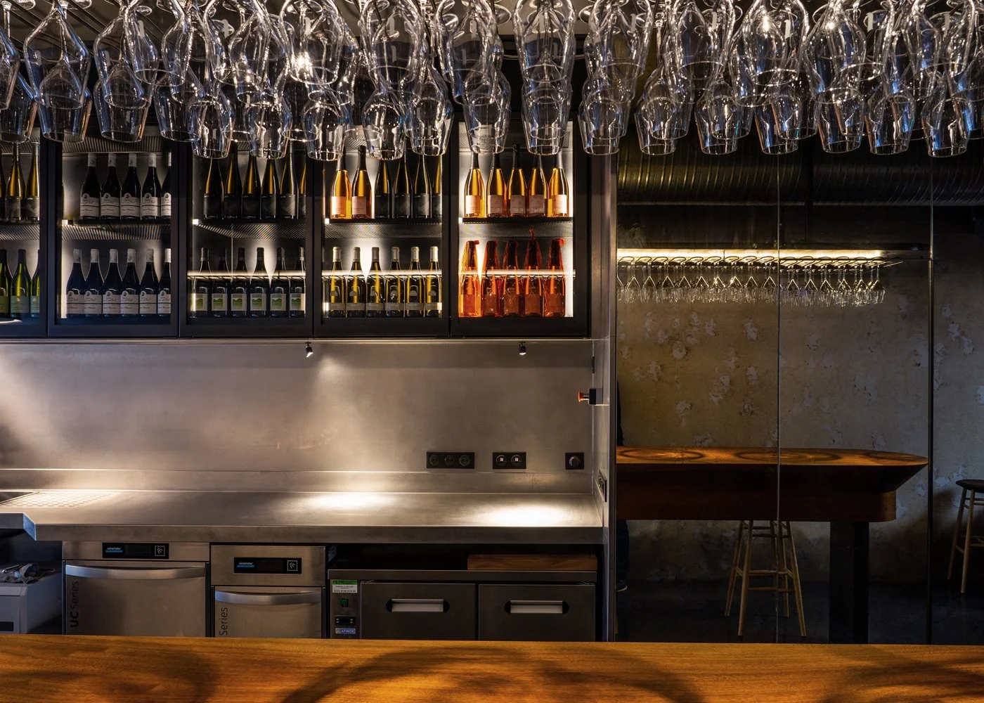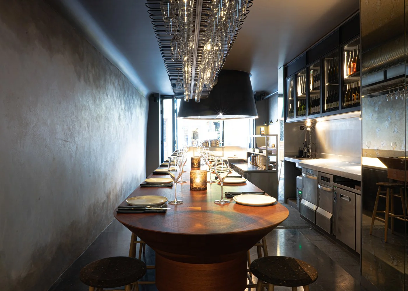 Ce bar à vins, situé au cœur du quartier du Marais à Paris, a été imaginé et scénographié à l’image d'un lieu dédié au spectacle de la gastronomie. C'est donc tout naturellement autour de la cuisine que le lieu s'est construit. En tête de proue de l'espace, une coiffe conique suspendue en acier laminé de plus d' 2m d'envergure, signale que c’est ici que tout se passe, à l’aplomb de cette hotte monumentale.