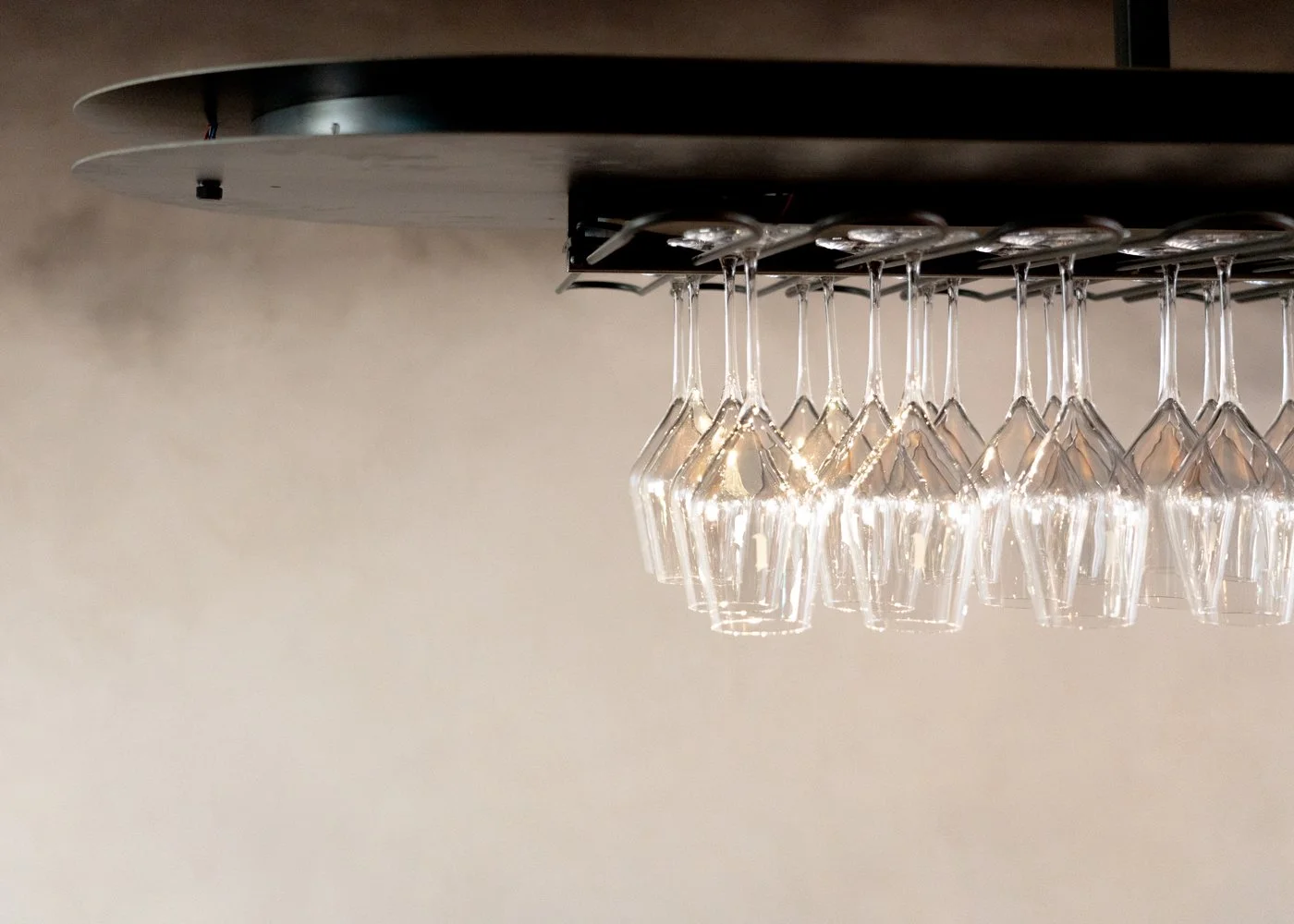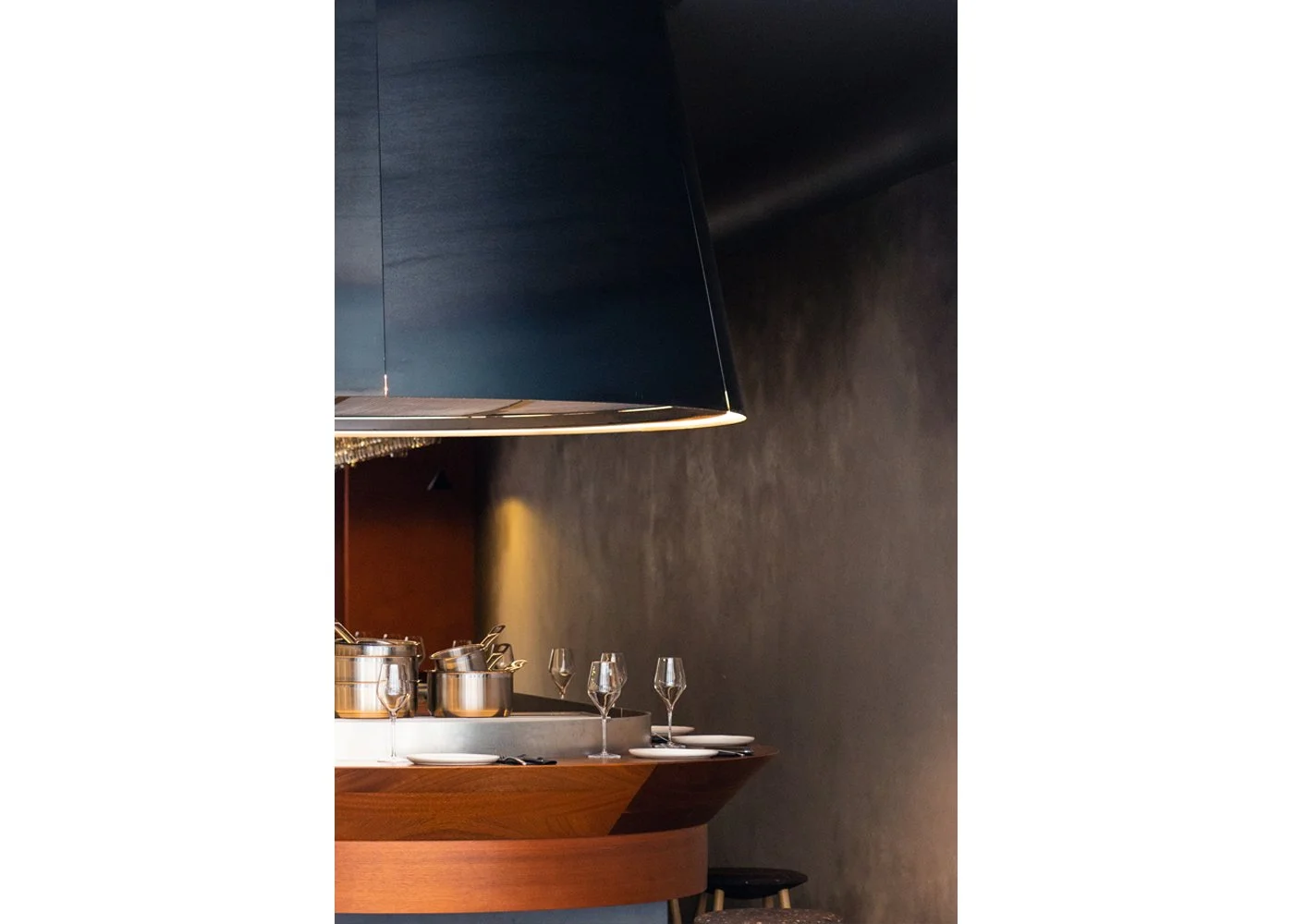 L'impact visuel de cet élément est d'autant plus fort qu'il contraste avec l'enveloppe dans lequel il est situé. Les murs enduits à la terre ont été imaginés telles des compositions oniriques évoquant les nuages de vapeurs culinaires se diluant dans l'espace grâce aux jeux de miroirs, au sol réfléchissant et au plafond obscur.