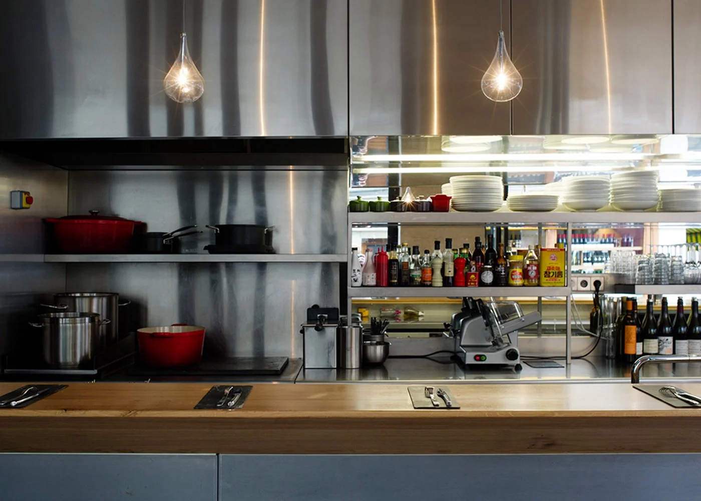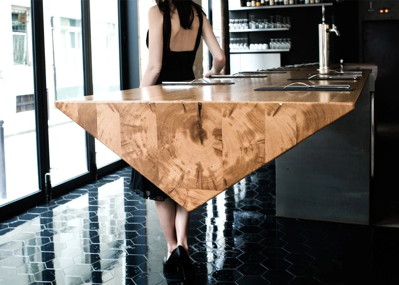 Une véritable mise en scène de la cuisine, s'opère grâce à la scénographie de l’espace. La salle se déploie autour d'un grand élément parallélépipédique composé de bois (chêne massif) et d'acier aux lignes franches et épurées, se déployant sur plus de six mètres de longueur.