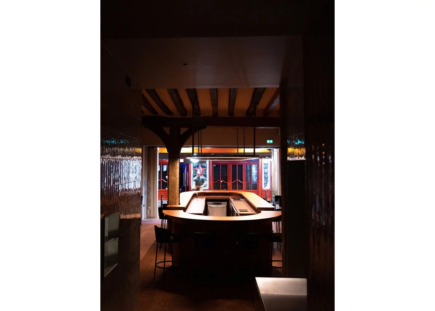 Un travail de revalorisation de la structure architecturale existante du local a été réalisé par le sablage des poutres du plancher et des poteaux en chêne, ainsi que par la mise à nu de certains murs en pierre. Le comptoir oblong, pièce maîtresse du bar, aux lignes nettes et affûtées trône au centre de la première salle; des étagères à bouteilles rétro-éclairées filantes sur toute la longueur de l'espace, reprennent la trame longiligne et régulière des poutres du plafond. Une seconde salle à l'arrière accueille une banquette aux formes plus libres et organiques venant épouser toute la périphérie de la pièce.