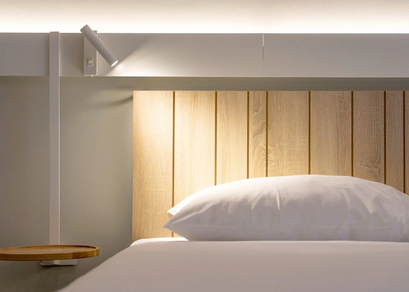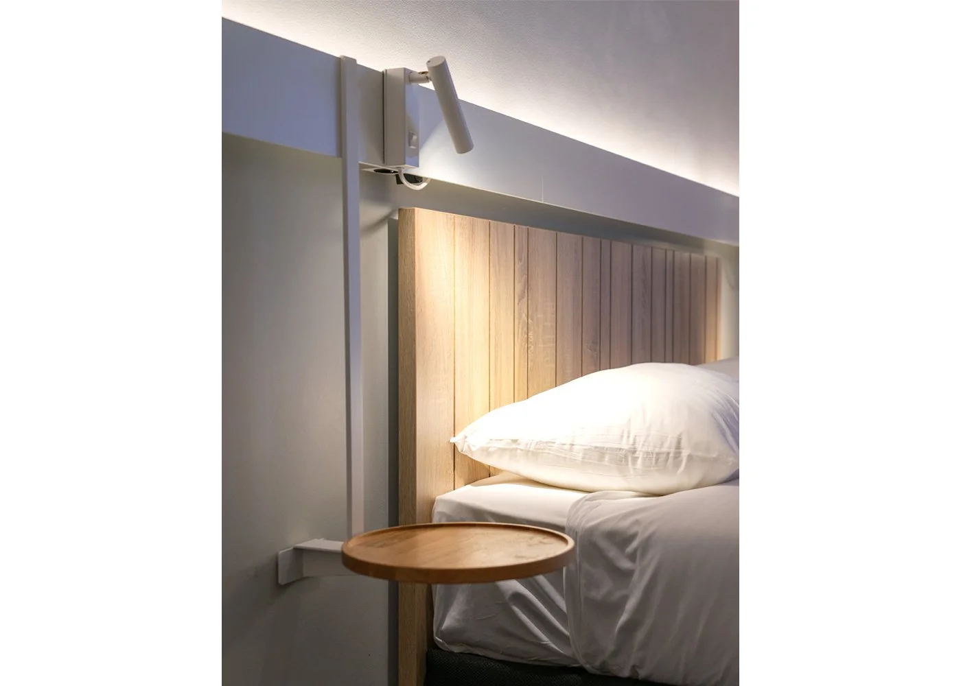 Une tête de lit «connectée» permet d'y plugger facilement les fonctionnalités indispensables à une chambre d'hôtel comme une liseuse, lampe de chevet / d'ambiance, bloc interrupteurs, patères...devient l'élément fort de la chambre.